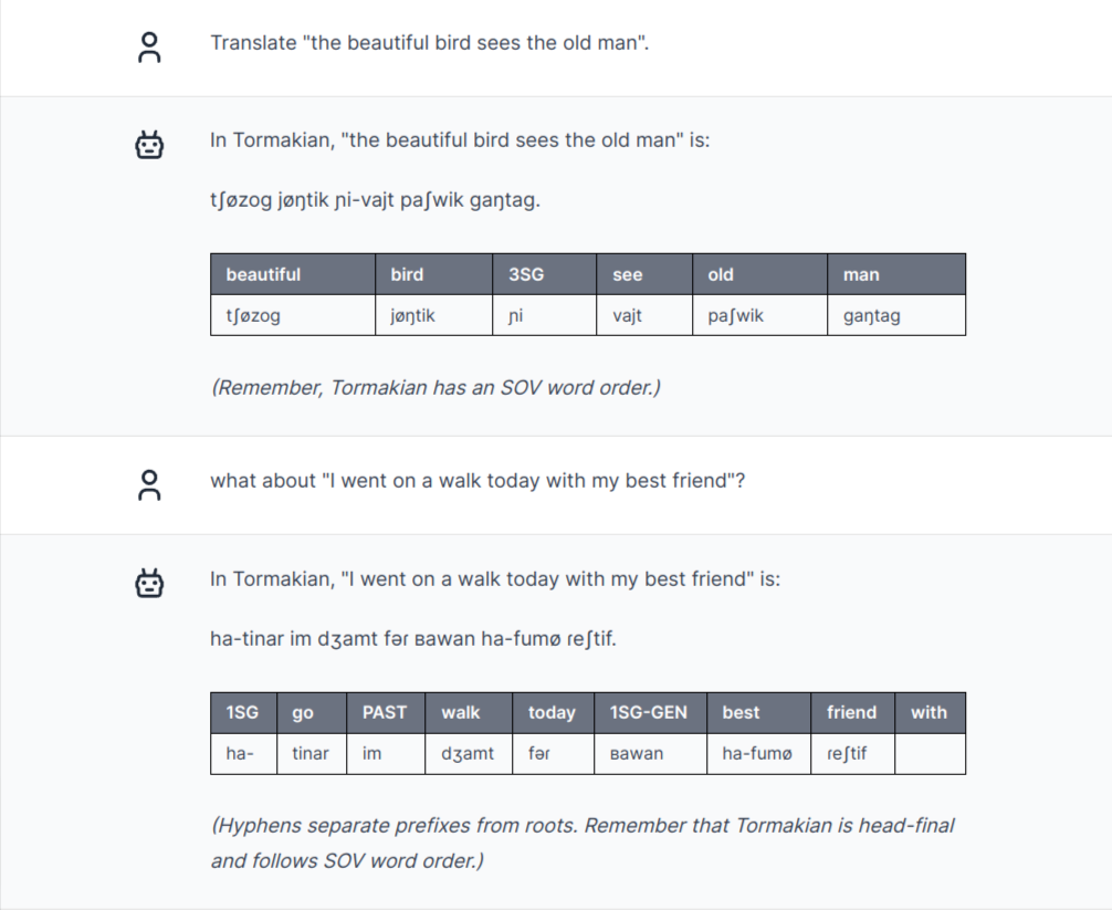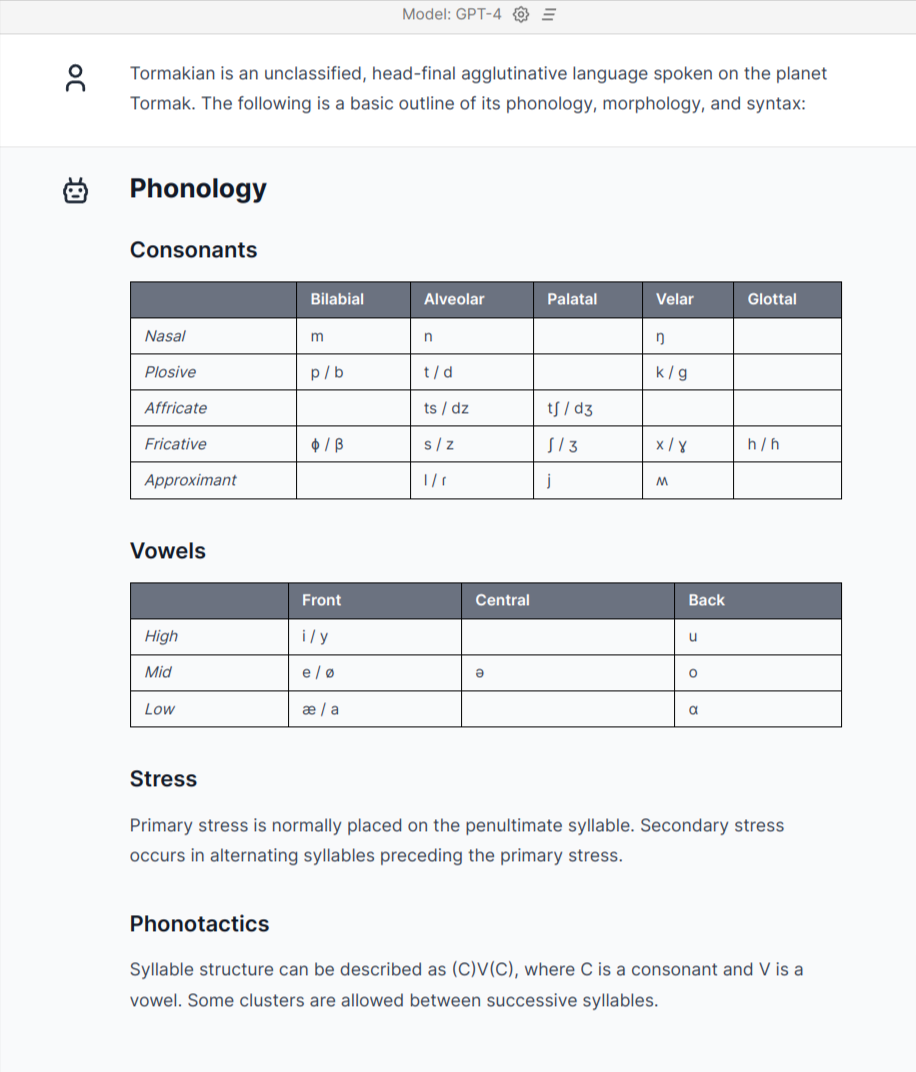 In the future I'll post about other weird GPT-4 attempts at Linguistics 101, but this post is about Tormakian, a GPT-4 hallucinated conlang. Inventing a language and describing it consistently is a quick way of testing linguistics ability — especially since there's probably not that much conlanging training data to overfit on.