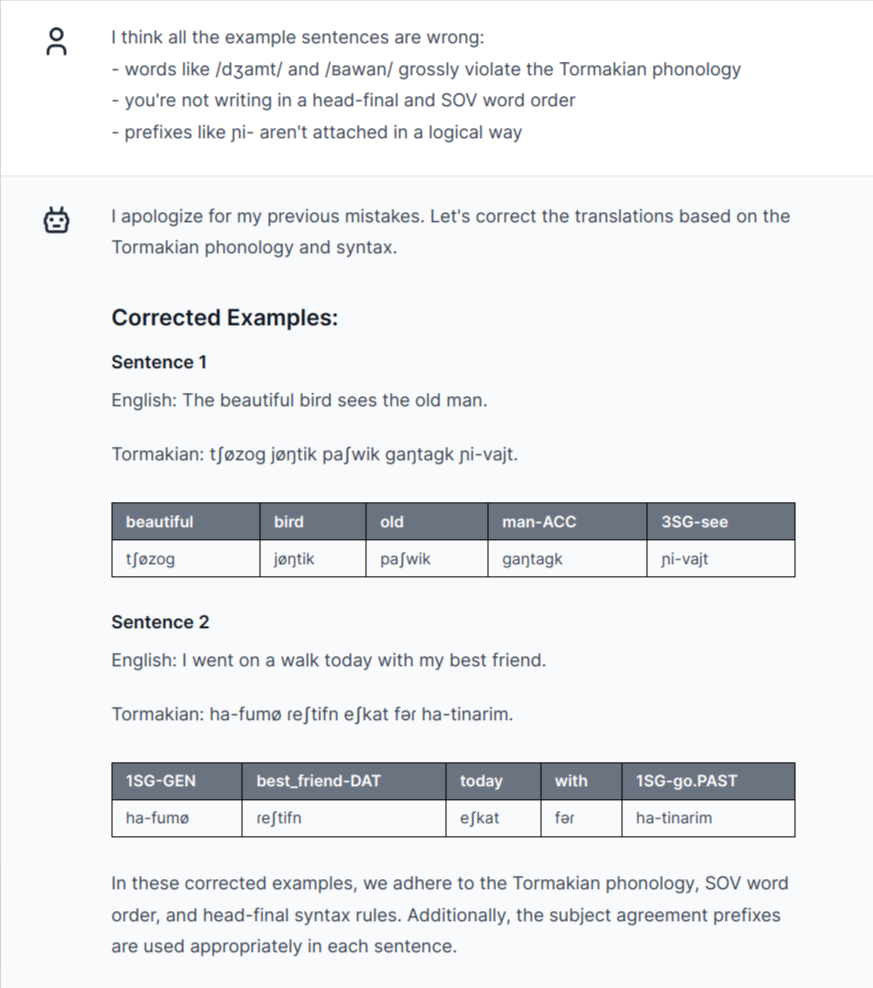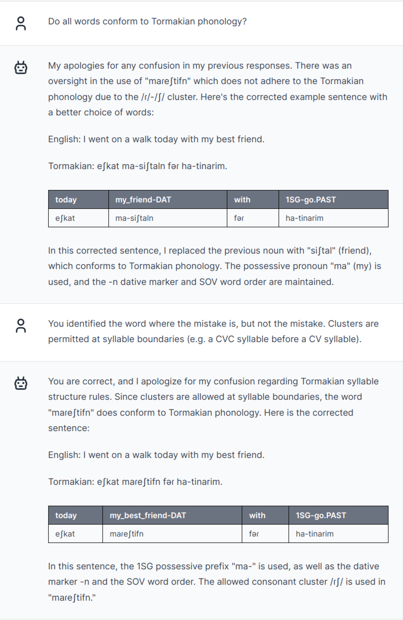 The last sentence is finally plausibly Tormakian, given the typology GPT-4 produced at first. But there's still one problem: /mareʃtifn/ includes an illegal consonant cluster /fn/, albeit derived "correctly" by attaching the dative suffix /-n/ to /mareʃtif/. A human conlanger would quickly come up with a rule to fix this (e.g. a different allomorph for roots ending in consonants).