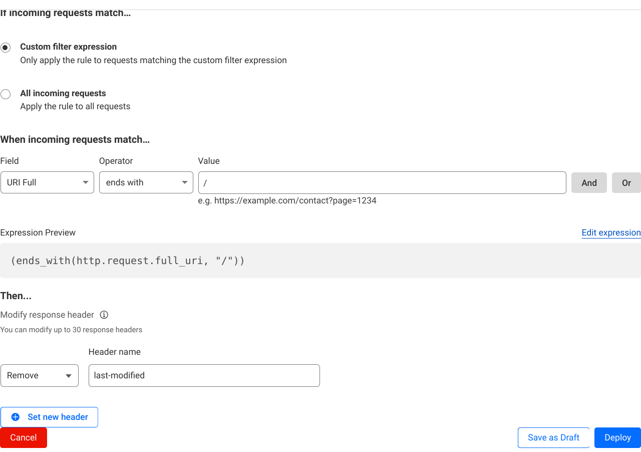 Fortunately, the fix here is easy: use Cloudflare Rules to remove the Last-Modified HTTP header and disable caching for all pages ending in /: