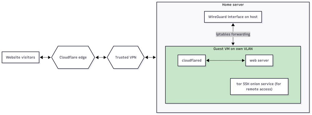 In a previous blogpost I outlined the way I host web services from my (laptop-based) home server with reasonable anonymity, using Cloudflare Tunnel and a trusted VPN:
